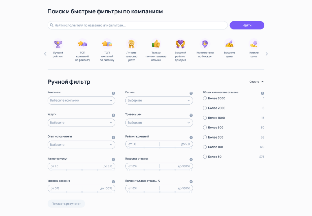 Рекомендуем: Выбрать нужные услуги; Кол-во отзывов – более 300; Рейтинг компаний – 4-5; Уровень доверия – 80-100; Качество услуг – 4-5. Нажмите "Показать результат"