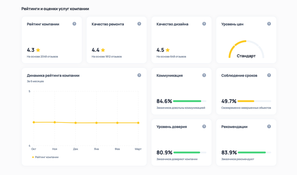 интерьера. На основе отзывов реальных заказчиков вы сможете узнать об оценке качества услуг, уровне коммуникации, соблюдении сроков, доле спама и уровне доверия к компании и многом другом.